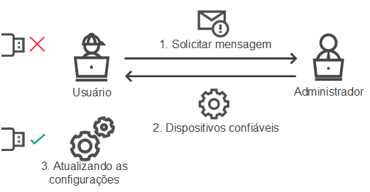 Se o Kaspersky Security Center não estiver implantado em sua organização, você poderá fornecer acesso a um dispositivo nas configurações do Kaspersky Endpoint Security. Por exemplo, você pode adicionar o dispositivo à lista confiável ou desabilitar o Controle de Dispositivos temporariamente.